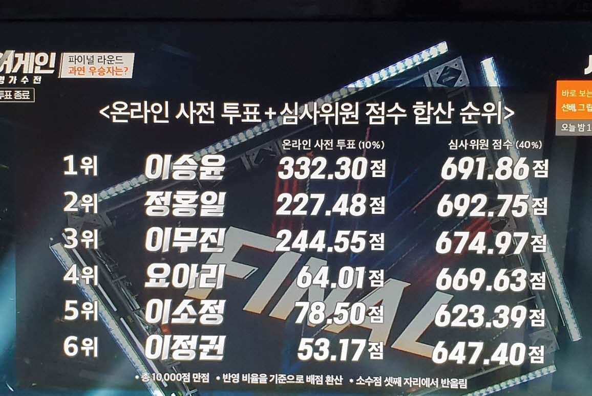 ์ฑ์ด๊ฒ์ธ ์ต์ข ๋ผ์ด๋์์๋ ํ6๊ฐ ๊ฒฝ์ฐ์ ํผ์ณค์ผ๋ฉฐ ๋ชจ๋ ์ ์๊ฐ ๊ณต๊ฐ๋์์ต๋๋ค.
